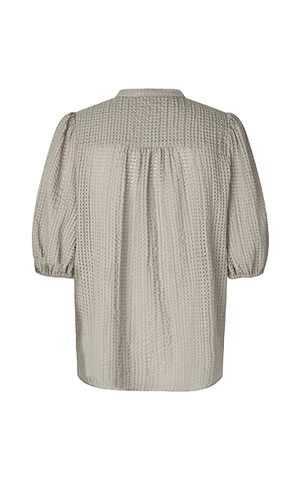 Second Female seersucker shirt. Made in a lightweight cotton blend with seersucker structure and checked see-through pattern. Fearing a mandarin collar with button-through fastening. Puffed shoulders with three-quarter length sleeves...
