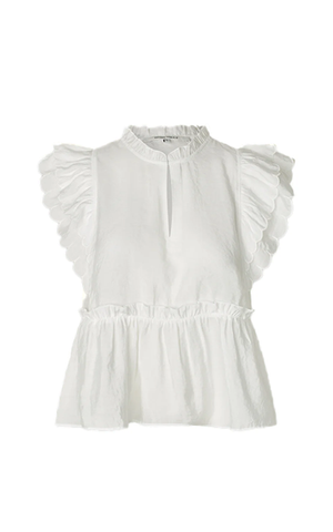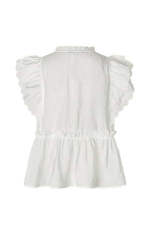 Second Female shirt with ruffled neck. The shirt is made in soft and drapy modal blend with a semi-sheer quality. Featuring a high neck with ruffled trim and button-through fastening....